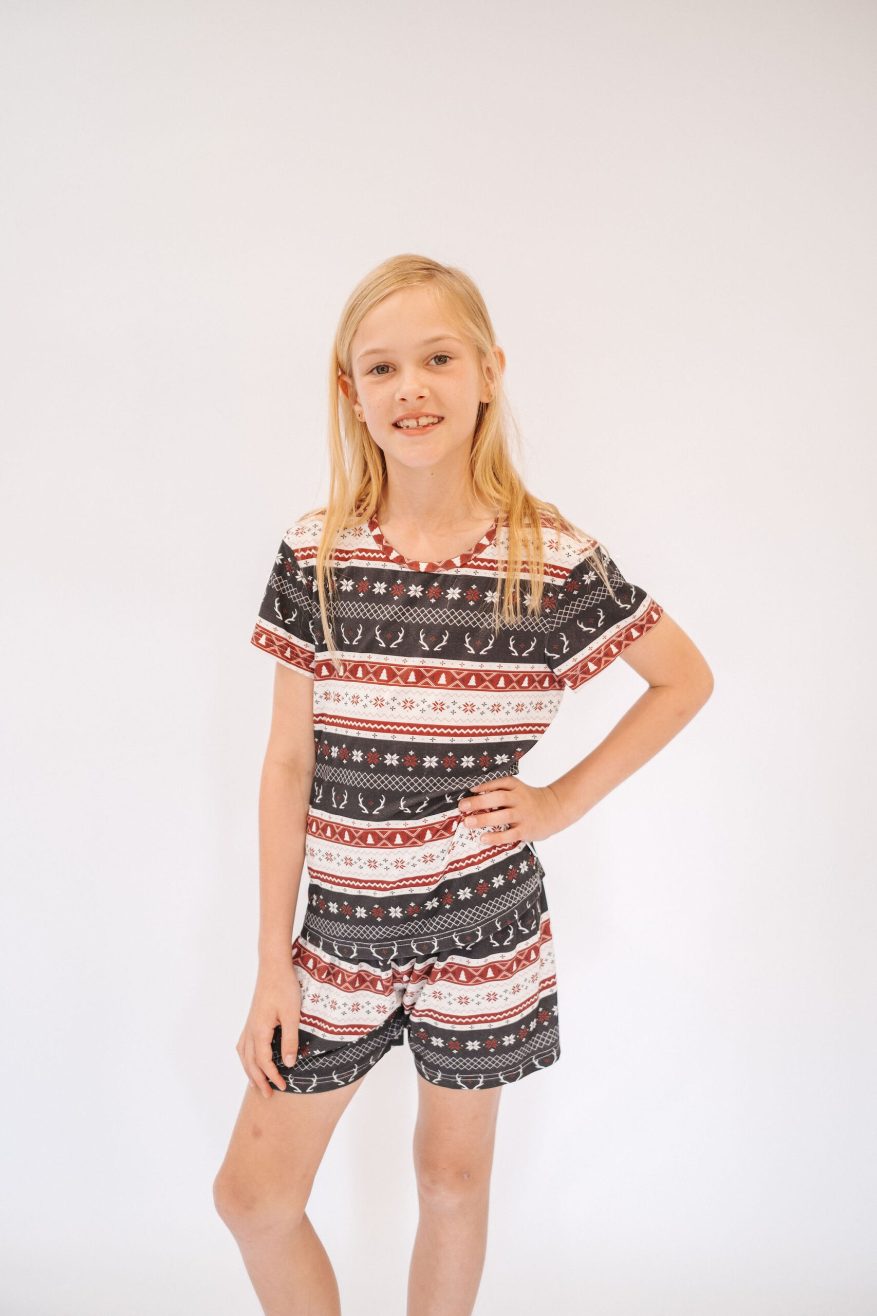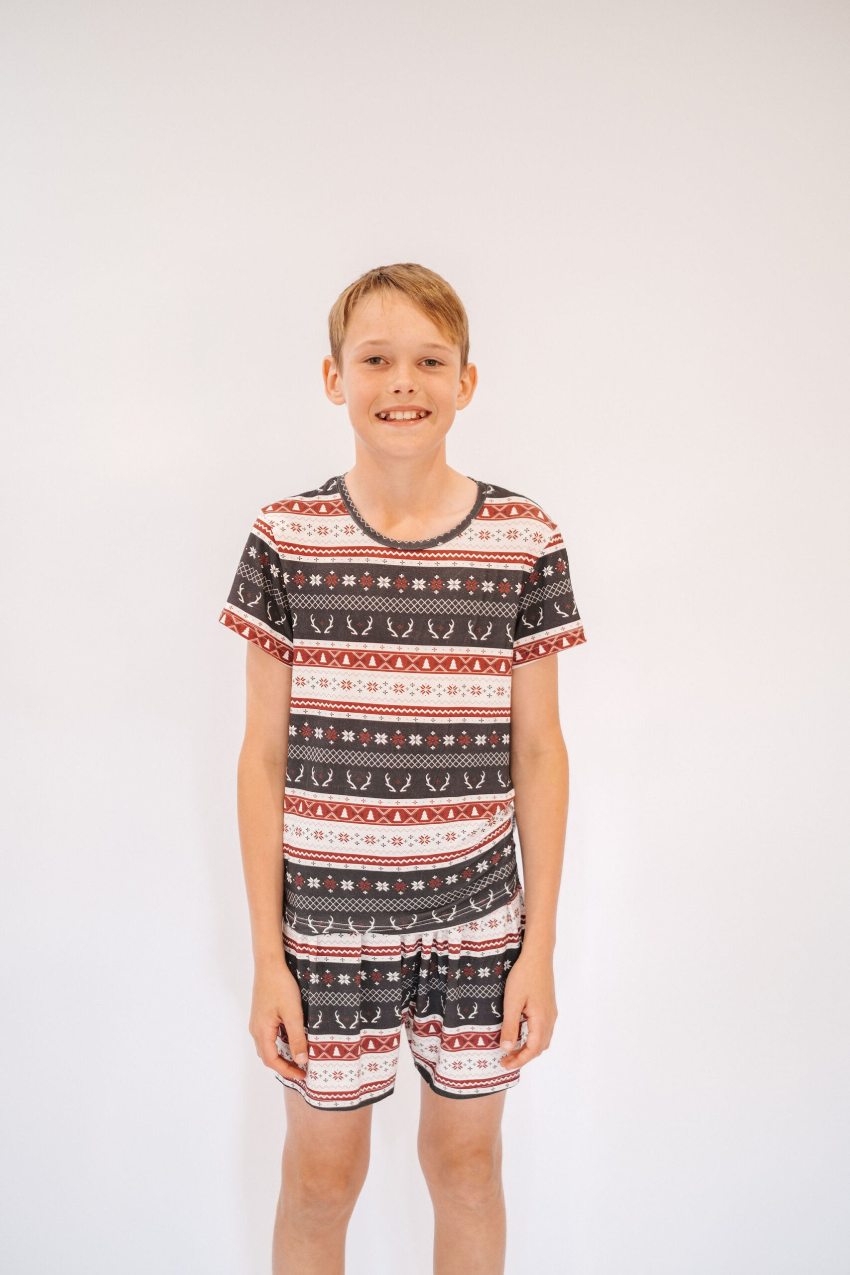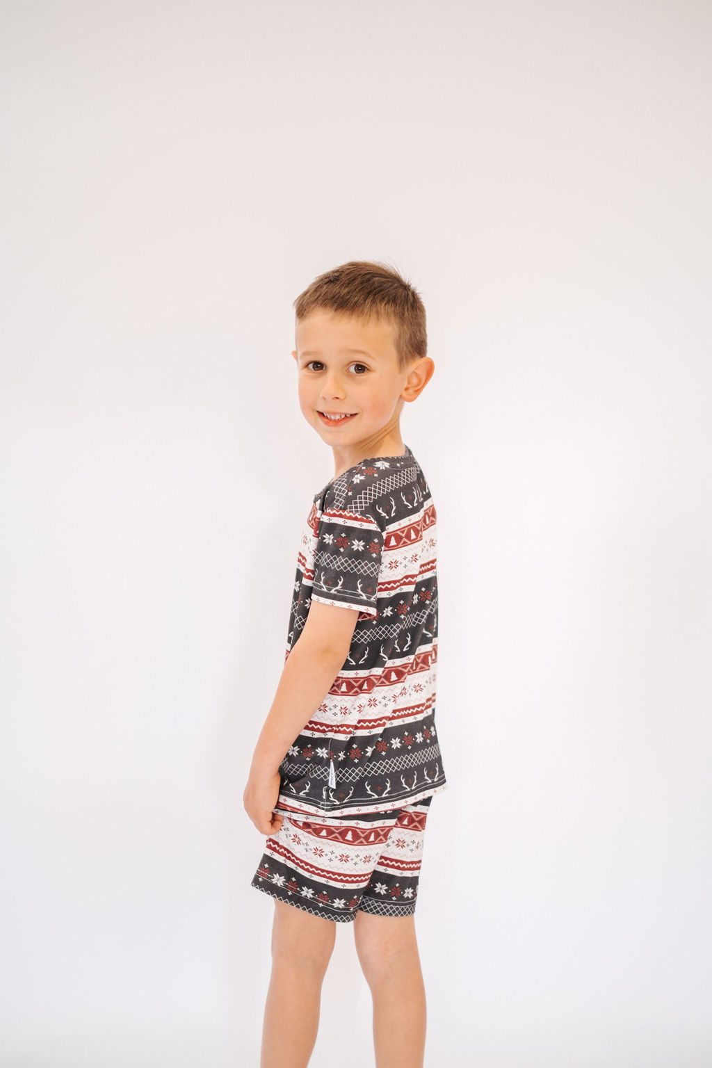 Match with your family and friends this Christmas in our Fair Isle pyjama set! This set features a pattern of snowflakes and trees combined with our signature antlers, in a sophisticated colour scheme of navy blue, maroon and cream. The Fair Isle print has been exclusively designed for Fawn & Hart and is traditional, classic and timeless. Made from an incredibly soft and breathable modal fabric, designed to keep you cool and comfortable this summer.